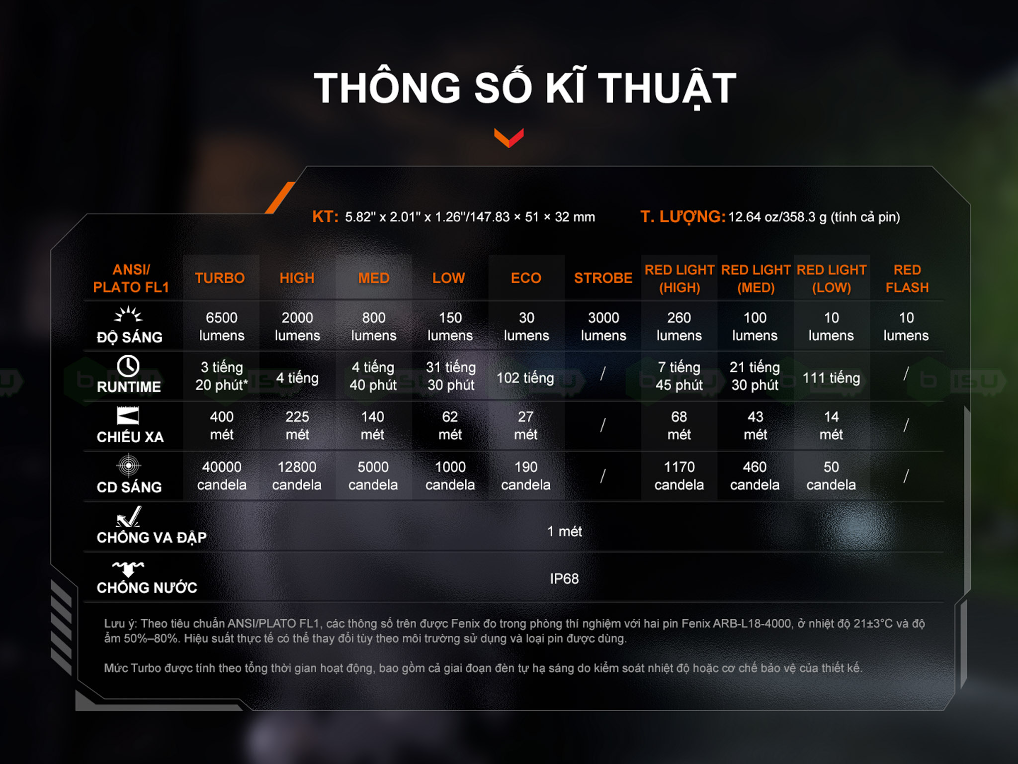 Đèn đạt chuẩn chống nước và bụi IP68 theo như hãng công bố. Thực tế thì nó hoàn toàn đủ an tâm để sử dụng trong trời mưa lớn chứ tuyệt đối không đem đi lặn cố ý ngâm nước bởi đây là một tính năng để phòng tránh và ngay cả đèn thân dạng ống truyền thống cũng sẽ bị từ chối bảo hành nếu hỏng do vào nước.