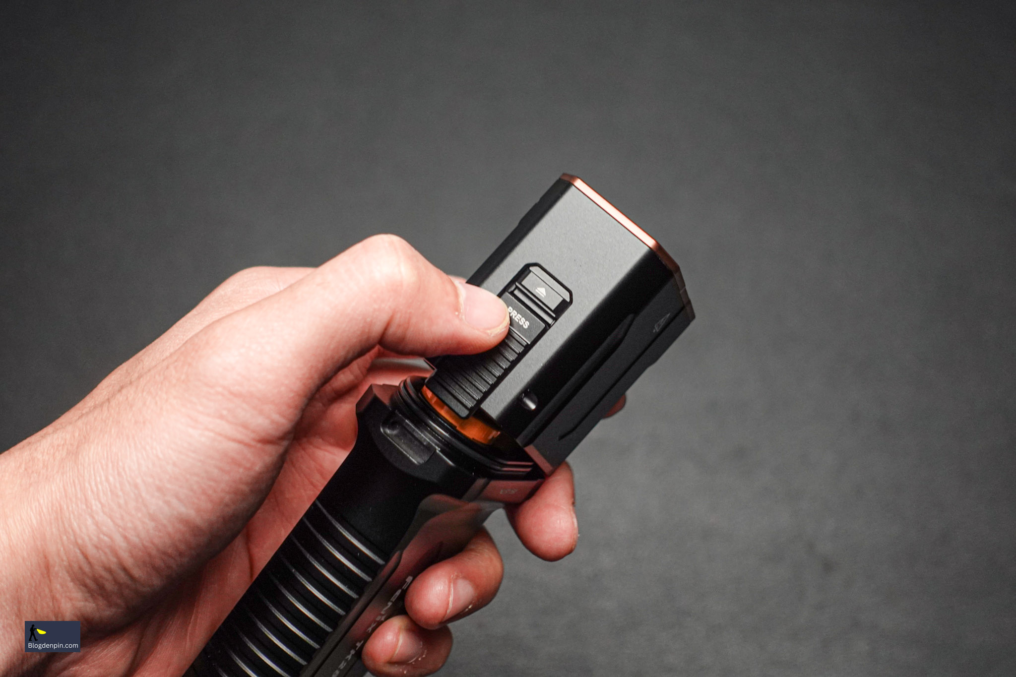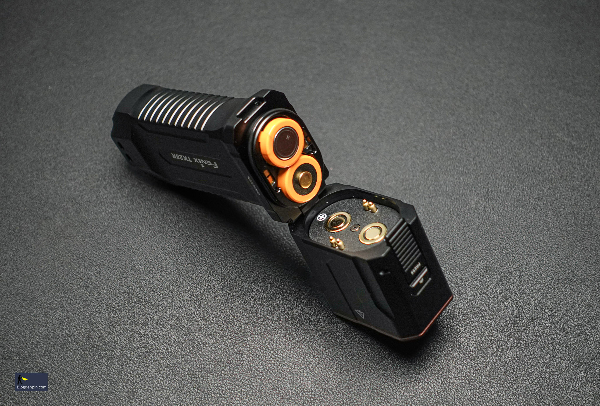 Với TK28R thì Fenix đã làm cơ cấu ở pin ở ngay phần cổ đèn với dạng bản lề, có gioăng cao su là chốt khóa 2 lớp đảm bảo kín, thao tác nhanh và chống bị vô ý mở bung ra khi đang sử dụng.