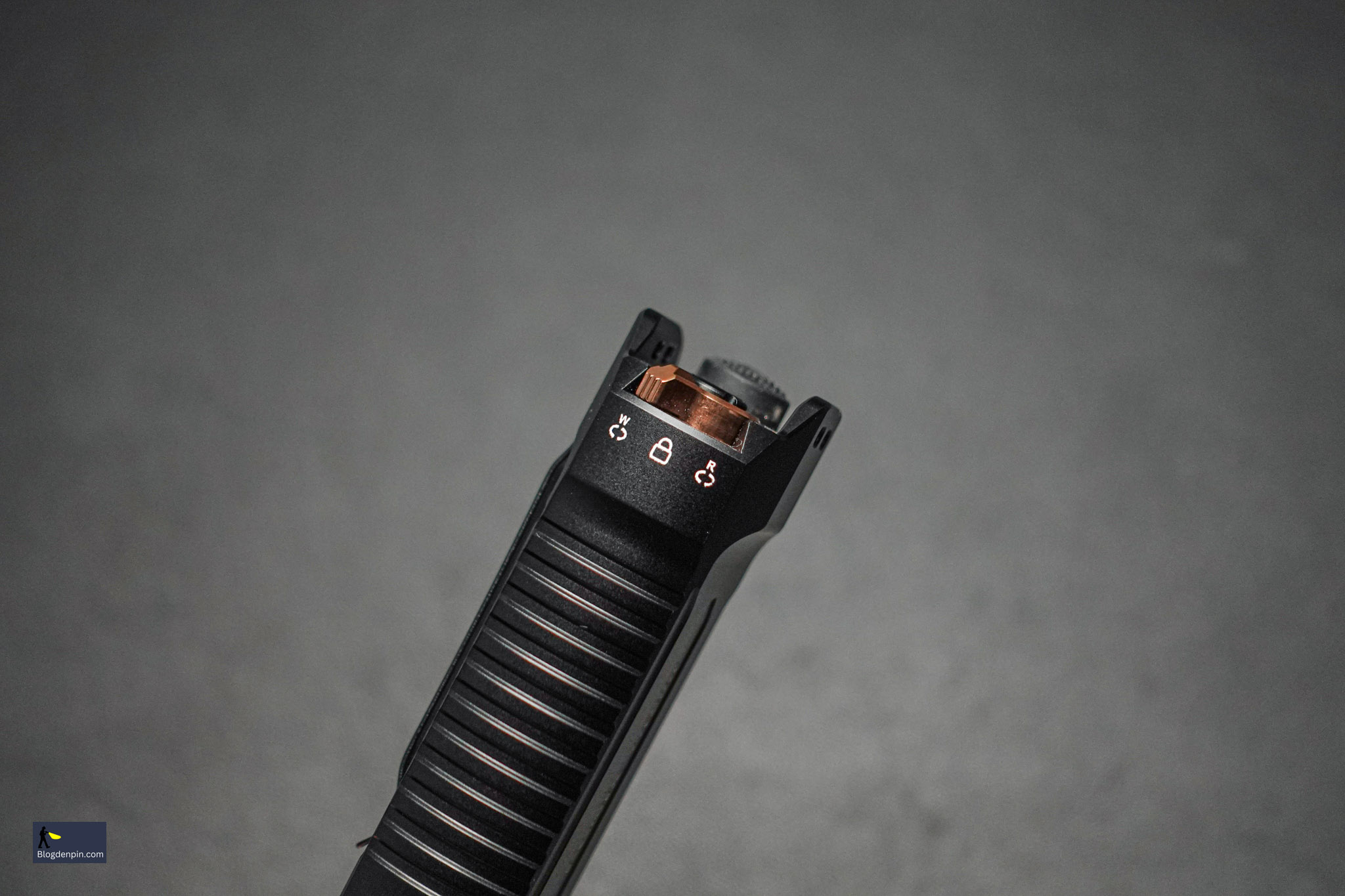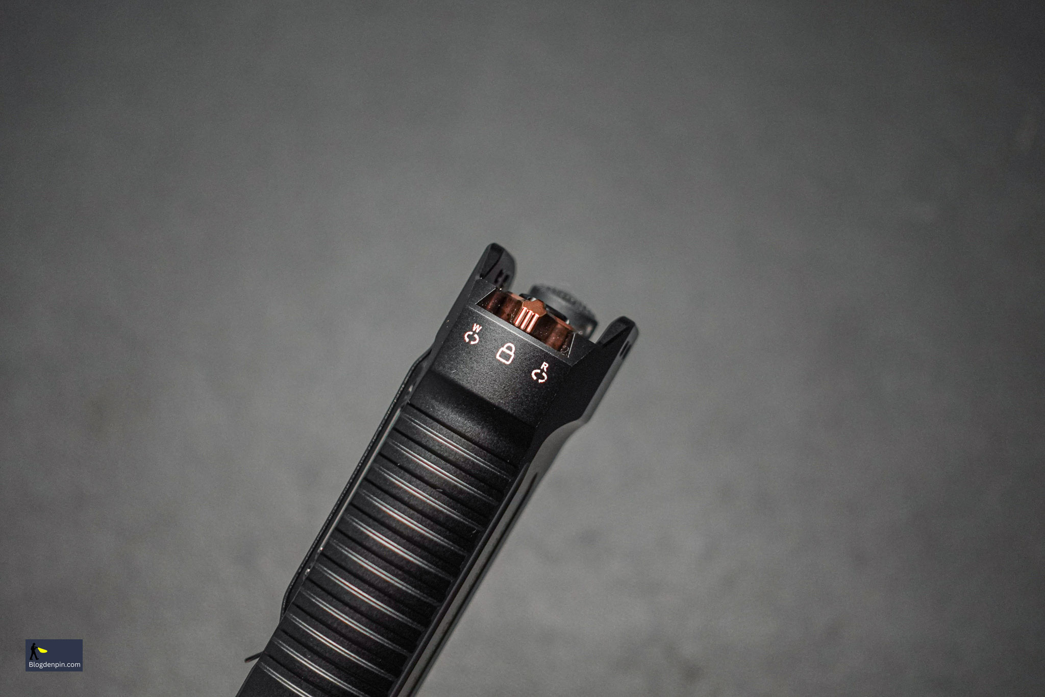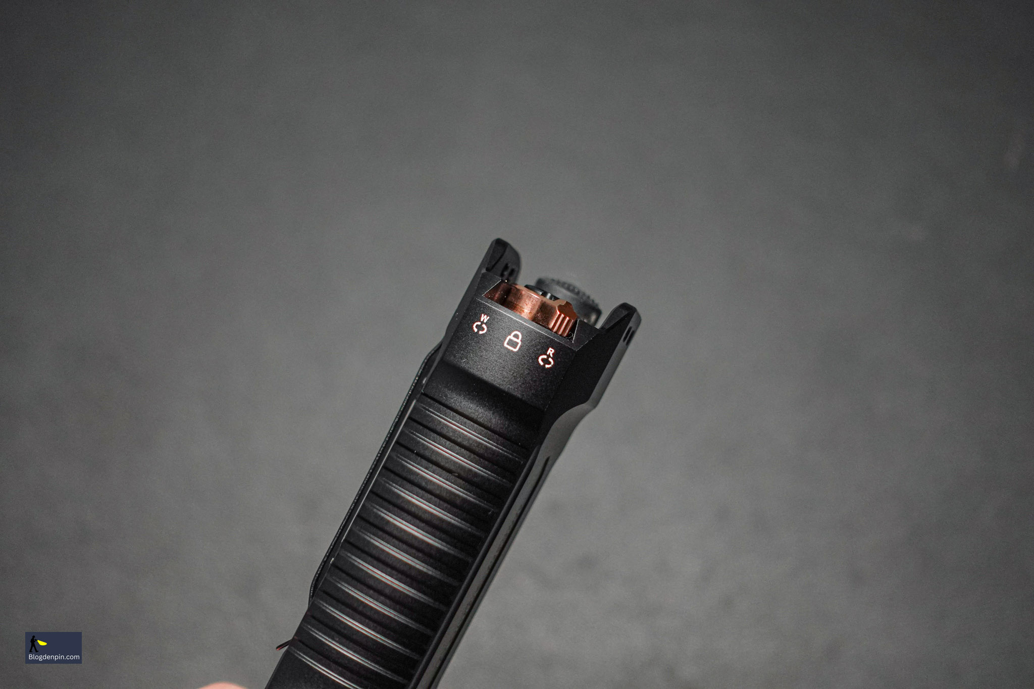 - Công tắc gạt để chuyển qua lại giữa 3 chế độ hoạt động: Sáng trắng – Khoá an toàn – Sáng đỏ
