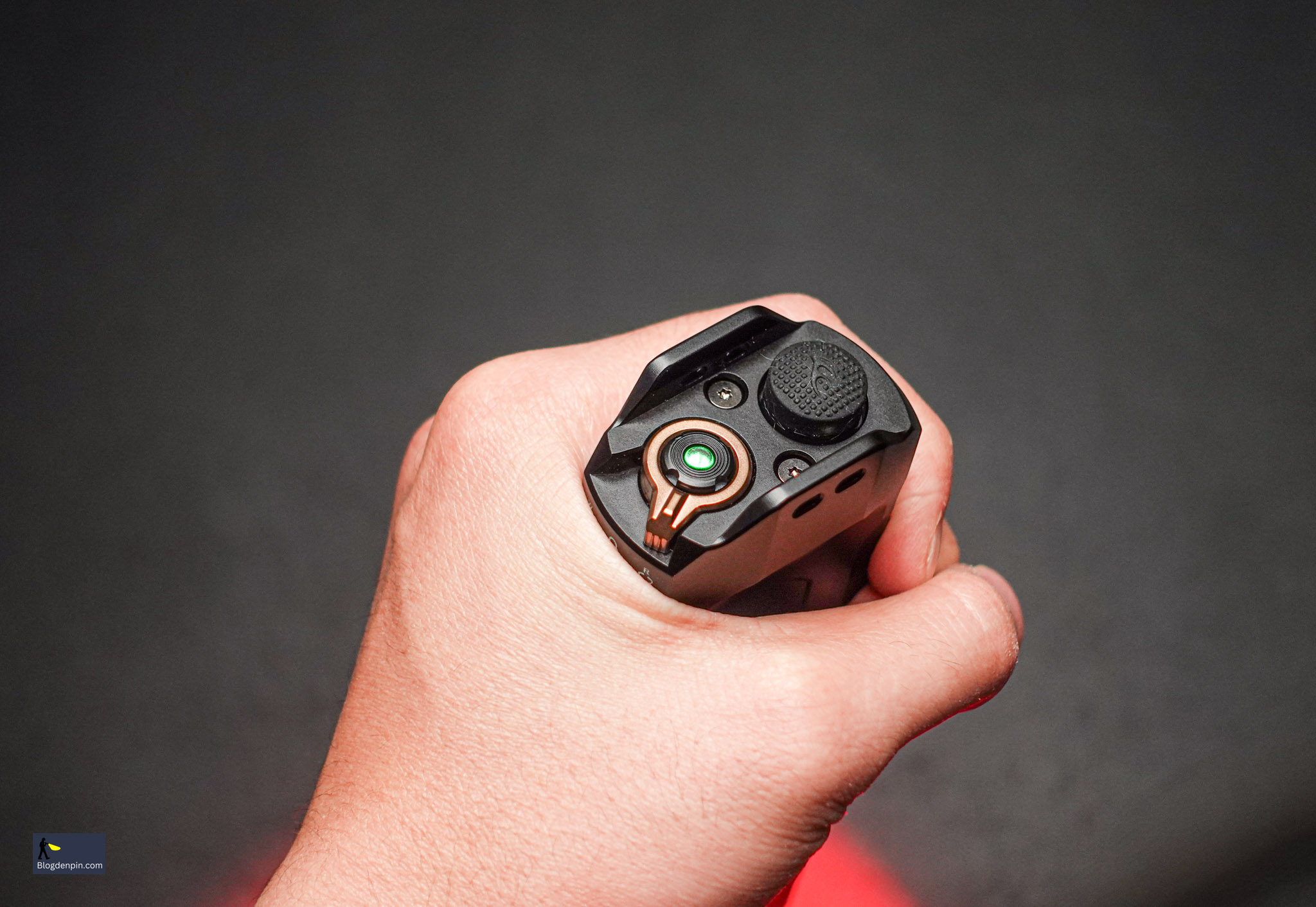 - Công tắc chức năng dạng nhấn để chuyển qua lại các mức sáng và kích hoạt nháy Strobe. Một đèn LED nhỏ để báo tình trạng pin cũng được đặt ở vị trí này.