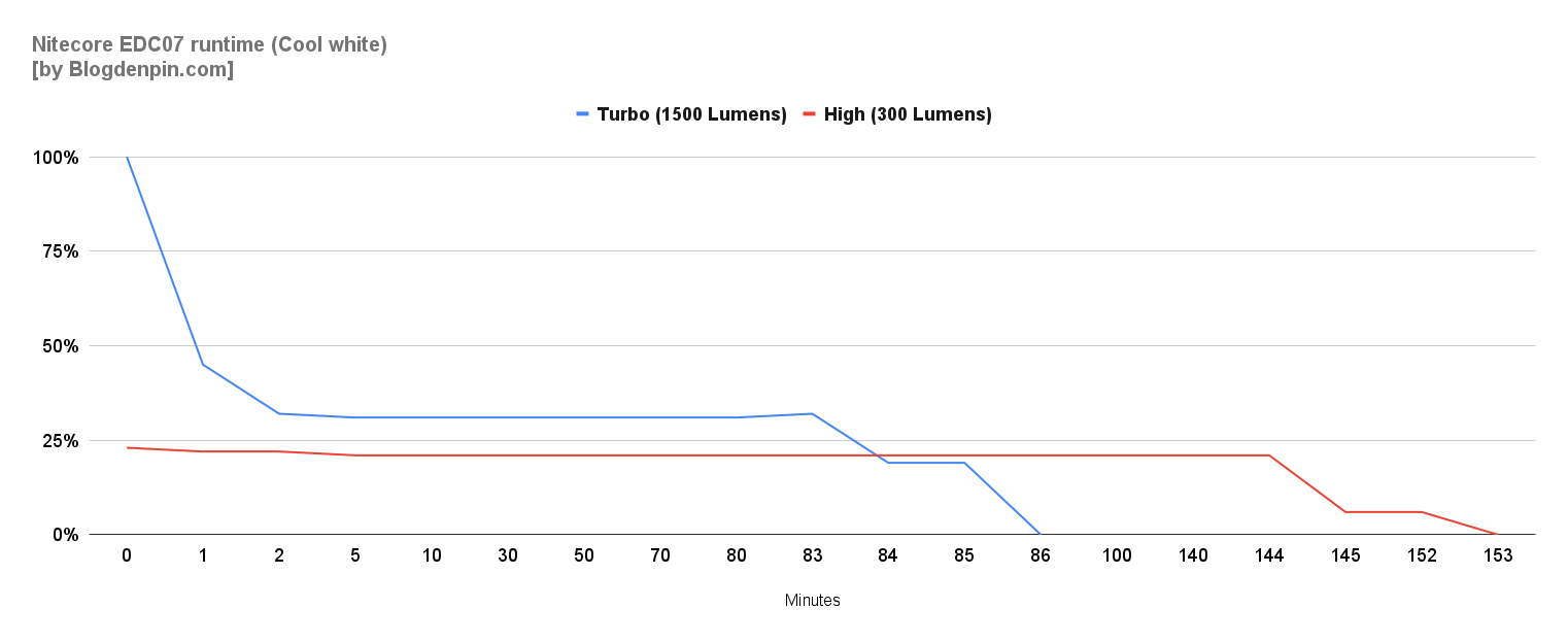 Mình đo runtime thực tế của EDC07 ở 2 mức sáng cao nhất ở nhiệt độ phòng 25°C và có sử dụng 1 quạt nhỏ để hỗ trợ tản nhiệt.